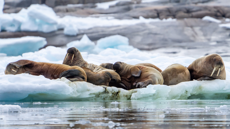 Phenomenal fjords, magnificent mountains ranges, and a polar desert rich in fossils set the stage for heroic tales of early exploration. See walrus hauled-out on sea ice or on beaches. On land, we stretch our legs on walks across tundra carpeted in brightly coloured wildflowers. We visit towering cliffs noisy with nesting guillemots and puffins, and scree slopes that hold Svalbard's largest little auk colonies.